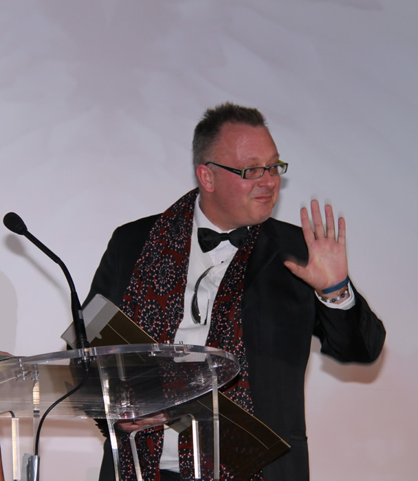 Applause for Martin Gooch on stage Angel Film Awards Celebration ..