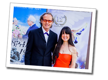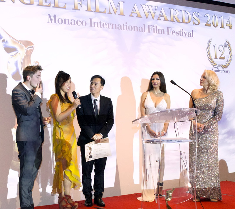 Award Winning Director James Tumminia ('My Christmas Wish') on stage with Jury Member Eun Oh in stunning traditional Royal Korean dress and our bellissima Mastress of Ceremonies Carole Ann Rice